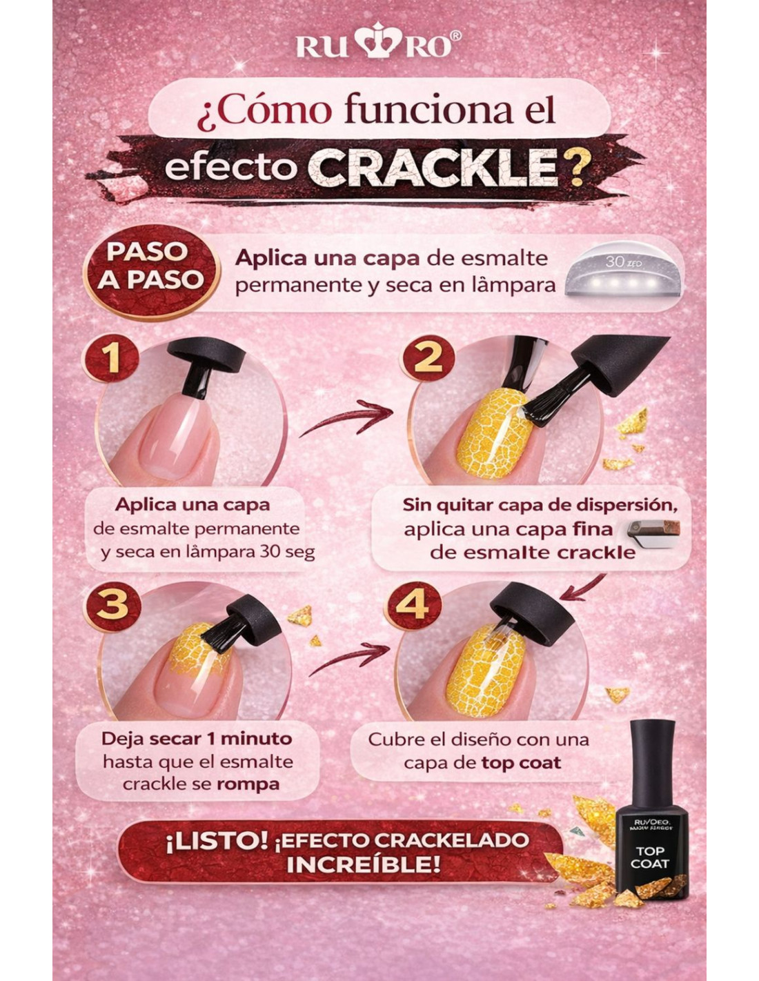 4) - Base Gel CRACKLE BASE (2 colores a elegir entre color Plata o color Oro). Se aplica una capa fina cubriendo toda la uña. Se seca en lampara 30-60 seg. Sin retirar la capa pegajosa, se aplica el esmalte Crackle (12 colores para elegir) capa fina o gruesa: según el efecto que se desea conseguir: